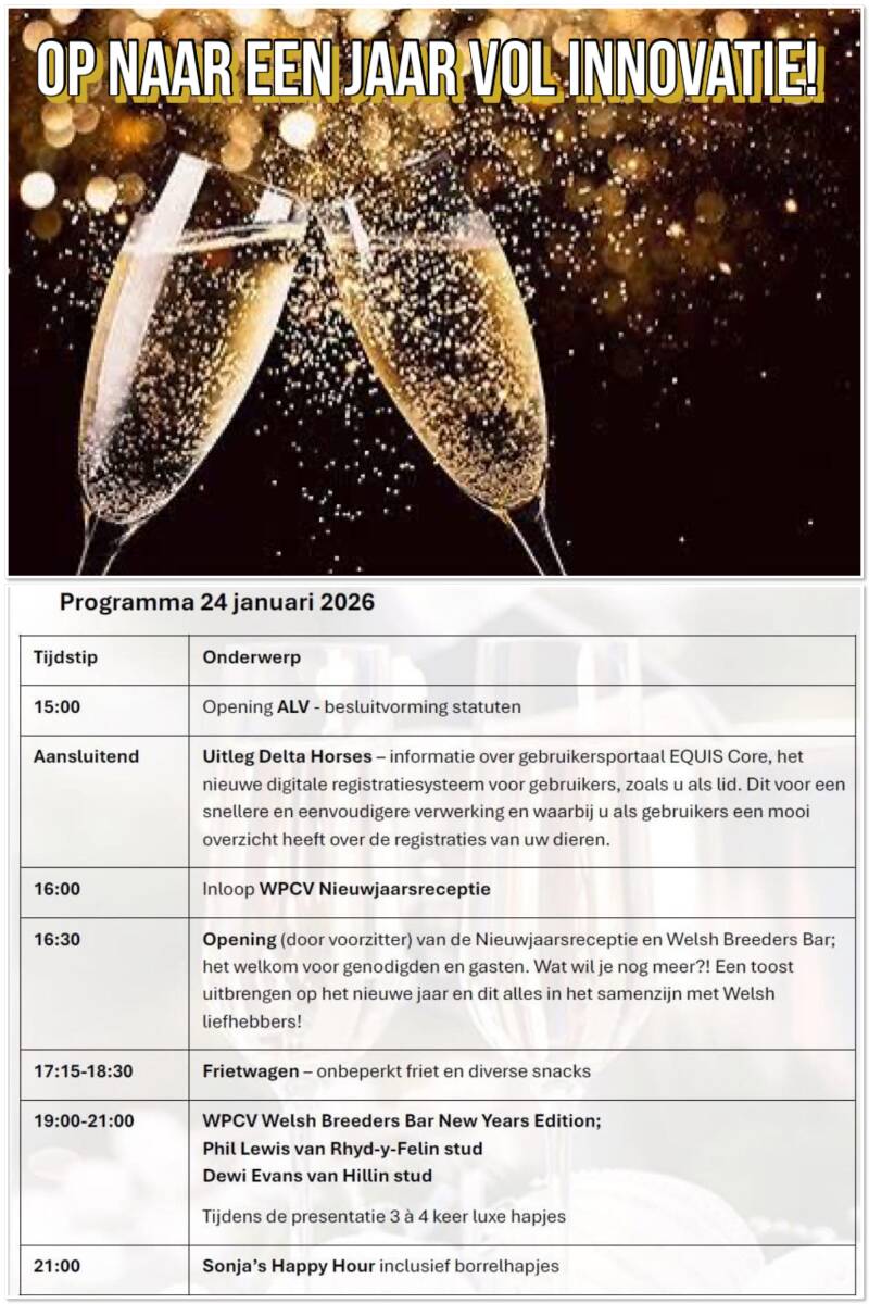 Programma: ALV + Delta Horse digitalisering uitleg (15:00-16:00u), Nieuwjaarsreceptie (16:00-17:15u), eten ((17:15-18:30u) en WPCV Welsh Breeders Bar ((19:00-21:00u)